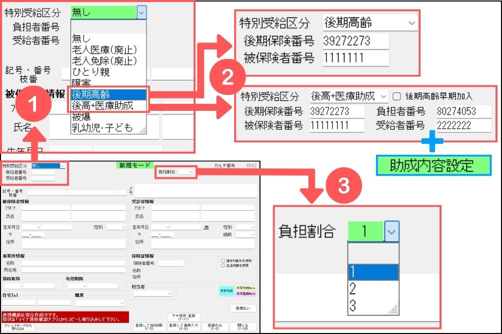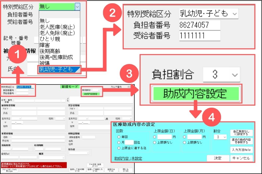 医療助成がある場合は、【負担者番号】【受給者番号】も入力し、【助成内容設定】も設定します。