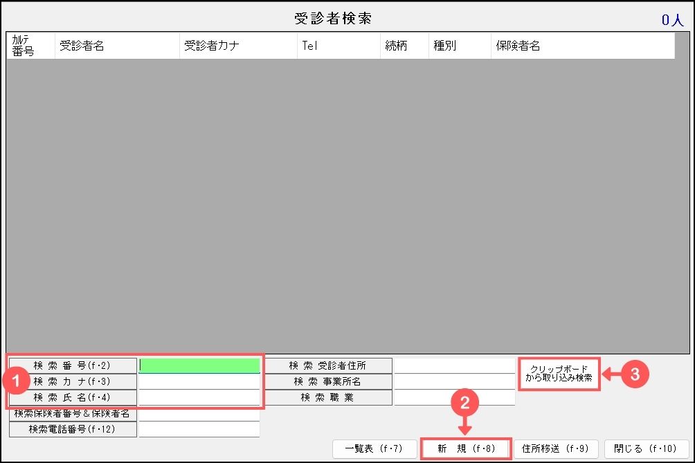 漢字で検索します。受診者番号が分からない、フリガナが分からない場合に使います。