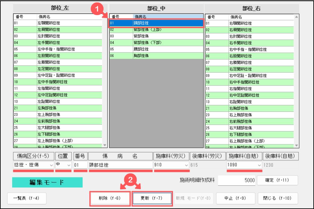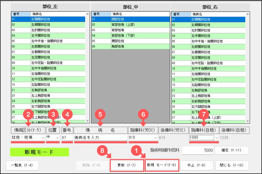 傷病・料金 登録では、労災自賠責の傷病の追加や編集