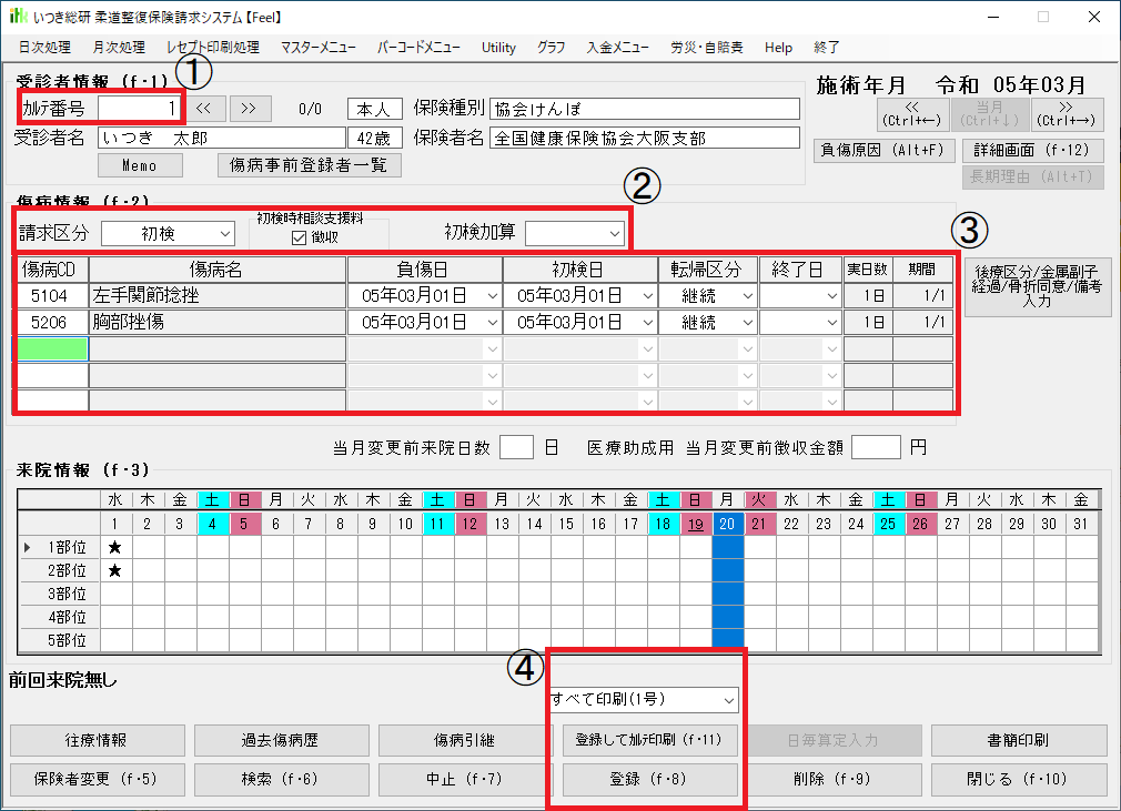 初検 初回来院時、前月末で治癒、前回来院から1カ月以上経過した場合(手動)
